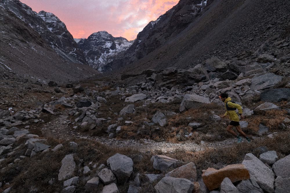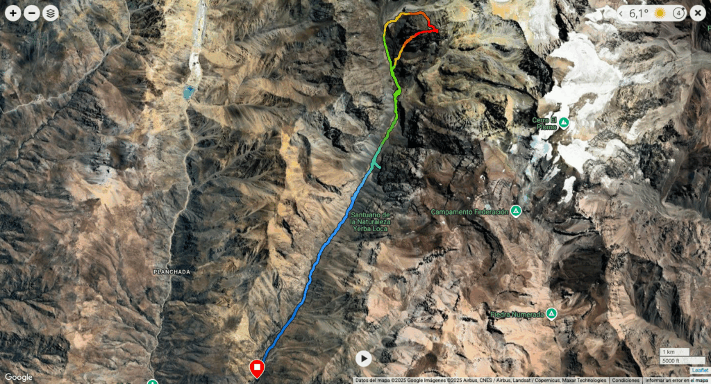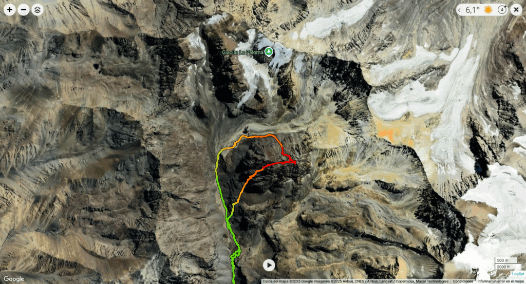 Ya se había hecho de noche, tenìa 2 baterías full cargadas para la linterna frontal, así que estaba tranquilo, sin embargo, no sé si por el frio o que pero comenzaron a fallar, funcionaban un rato, se apagaban y se volvían a prender. Sentí cierta preocupación, fue ahí cuando me di cuenta que una luna gigante me iluminaba absolutamente todo. Sonreí y comencé a disfrutar. Flui por varios destrepes mixtos sin problemas, hasta que me tope con un paredón que no podía desescalar, me puse a buscar a la derecha, a la izquierda, nada, subí un poco para buscar otra alternativa, pero estaba super cansado y la subida contemplaba un acarreo imposible, seguí buscando a luz de luna y de repente ! encontré un anclaje con 2 clavos ! simplemente no lo podía creer. Parecían viejos y estaban unidos por una anilla completamente congelada. Revise en que condiciones estaban, le metí carga y simplemente confíe en ellos. A pura luz de luna instale la cuerda y descendí sin problemas, los crampones al resbalar por la roca producían chispas que parecían estrellas fugaces en la noche, en ese momento me di cuenta que al parecer estaba teniendo las primeras alucinaciones. Me sacudí la cabeza y mire el reloj, ahí me di cuenta que ya llevaba casi 20 horas de actividad, por lo tanto llevaba más de 26 horas despierto, por lo que el cansancio y la deshidratación estaban haciendo lo suyo en mi mente produciéndome alucinaciones. Sin embargo de una otra forma lo estaba disfrutando, seguí ejecutando con precisión y llegue al fin del rapel, saquè la cuerda y seguí destrepando hasta el fondo del valle. Había llegado por fin al pie de la ladera y ya estaba en el valle sobre el glaciar, ahora solo se trataba de caminar con tranquilidad.
