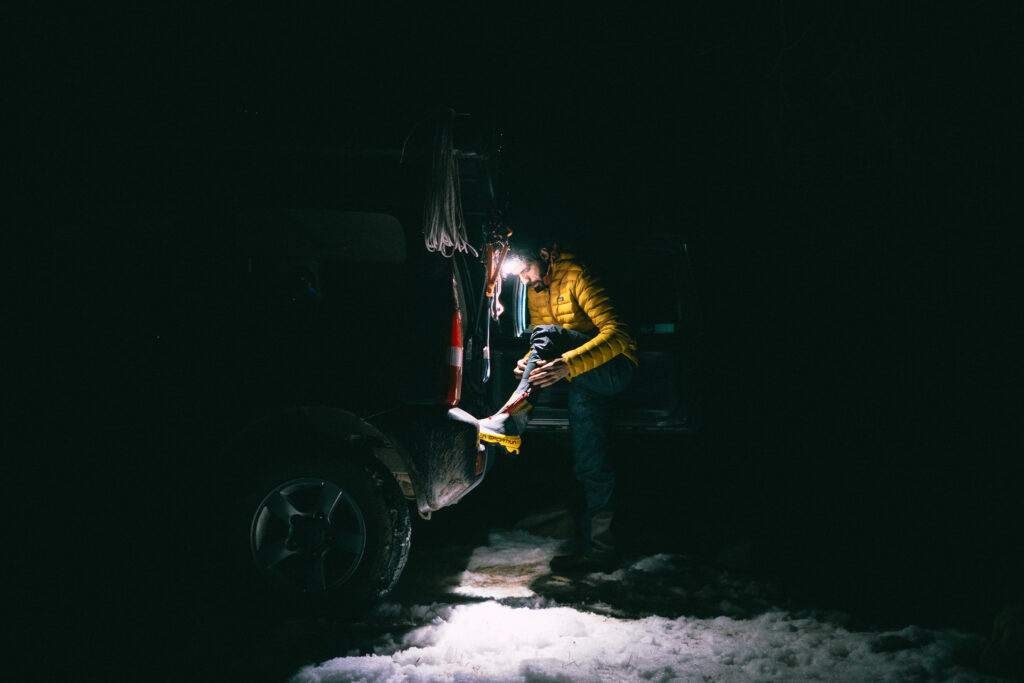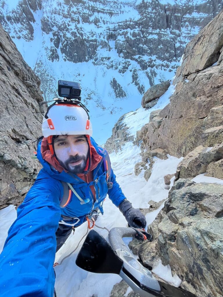 Solo llegar a pie de vía requería una caminata de 15 kilómetros con 1.500 metros de desnivel, nada que no hubiera hecho antes, pero ahora seria caminando por nieve profunda, así que sabia que iba a ser una larga lucha. Había calculado unas 5 horas para llegar hasta Piedra Carvajal, que es desde donde parte la escalada, de manera tal de estar a pie de vía a las 7 de la mañana con el sol saliendo para iluminar. Mis cálculos fueron precisos, llegue a eso de las 7:10, me senté a mirar la pared mientras prendía la cocinilla para prepararme un café. No tenia un track para hacer el ascenso propiamente tal, solo sabia que era una de las canaletas de la pared SurOeste que dan hacia Piedra Carvajal. Así que a punta de instinto me monte en la ladera y comencé metiendo crampones y piolet cuesta arriba. La calidad de la nieve estaba exquisita, a esa hora estaba firme y compacta, por lo que pude moverme con fluidez a pesar de no saber si estaba exactamente en el canalón correcto. Todo el ascenso transcurría entre laderas con buena nieve, canalones cerrados con hielo, grandes paredes de roca y ricas chimeneas mixtas, pura diversión con pasos de hasta V grado, los que pude pasar sin asegurarme.