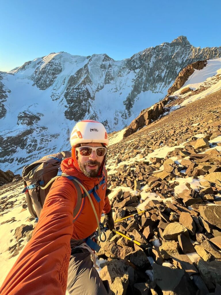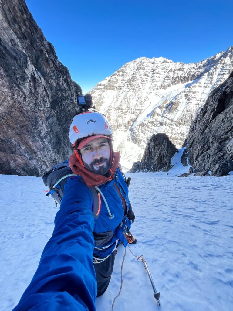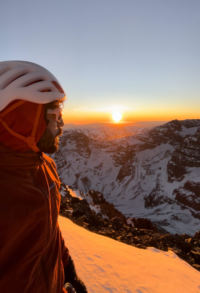 Abandonar casi no era opción, no solo porque no quería desertar, sino que ademas eso iba a requerir hacer múltiples rapeles por la cara sur oeste, por donde había subido, en una ruta que no tenia ningún anclaje instalado por lo que tendría que abandonar material, stoppers, cordines, etc y eso no necesariamente me gusta, no por perder material, sino porque quería evitar dejar rastros en la montaña. Así que opción 1 descartada. Opción 2 que era improvisar un vivac, a pesar de que no voy preparado para hacer un campamento, siempre llevo conmigo una manta de supervivencia y un saco ultraligero de patagonia, así con eso ante cualquier emergencia puedo improvisar un vivac y pasar la noche. No me gustaba mucho la idea porque en primer lugar no había ningún sitio apto para tirarme y tendría que aguantar 12 horas en esas condiciones, de 7 pm a 7 am del día siguiente cuando saliera el sol para iluminar el descenso. Sin embargo parecía ser la opción más inteligente y segura, así que armé un pequeño espacio entre la nieve y la roca y me dispuse a intentar dormir. No aguante ni 15 minutos, entre la incomodidad, el peligro latente a moverme en la noche y caer, el frio y en mi cabeza solo pensaba en las 12 horas en esa posición. Me levante, volví a meter todo en la mochila y me lance a la cumbre. Fue uno de los atardeceres más hermosos que he podido vivir en una cumbre, un atardecer anaranjado, mágico y cálido. Había hecho cumbre entre la inmensidad de montañas y glaciares, en solitario y en invierno. Estaba completamente agotado pero la sensación del logro y a la vez mi diminuta existencia en esa inmensidad me dieron un golpe de humildad y un hermoso regocijo de felicidad plena. Un par de fotos, un video y comenzar el descenso.